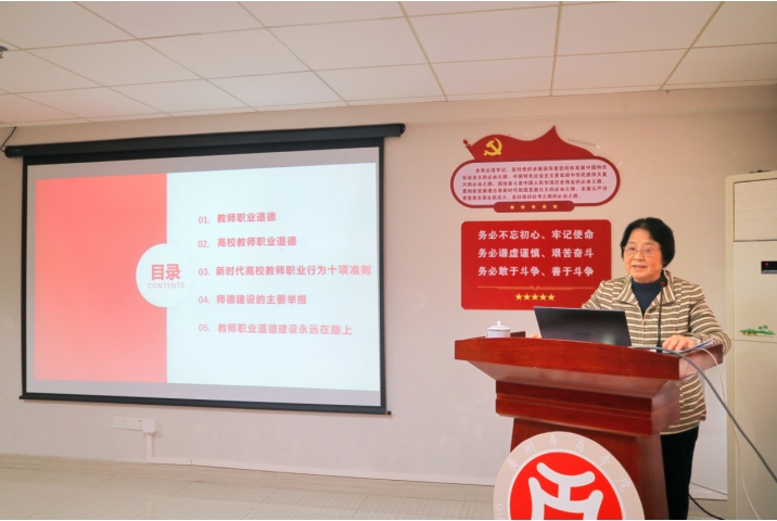 随后,会议邀请支戈壁副董事长作第一场《浅谈教师职业道德建设》专题培训讲座。支副董事长深刻诠释了师德的内涵以及高校教师职业道德在新时代教育事业中的重要意义,明确高校师德建设的规范和遵循,为青年教师解读了《新时代高校教师职业十项行为准则》,介绍了公司师德建设的主要举措,并结合了近年来校内外高校教师失范典型案例,提醒青年教师守好师德师风这一红线。此外,她表示教师职业道德建设永远在路上,要站在立德树人的高度,探索教学育人工作的新思路和新方法,将高校教学工作融入培育时代新人的切实行动中。