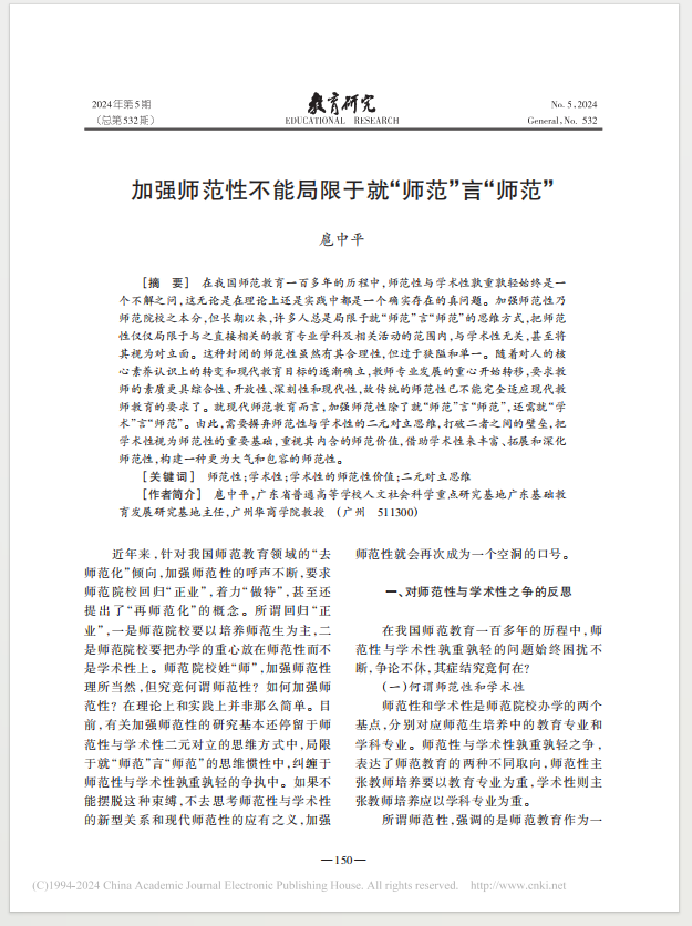 摘要:在我国师范教育一百多年的历程中,师范性与学术性孰重孰轻始终是一个不解之问,这无论是在理论上还是实践中都是一个确实存在的真问题。加强师范性乃师范院校之本分,但长期以来,许多人总是局限于就“师范”言“师范”的思维方式,把师范性仅仅局限于与之直接相关的教育专业学科及相关活动的范围内,与学术性无关,甚至将其视为对立面。这种封闭的师范性虽然有其合理性,但过于狭隘和单一。随着对人的核心素养认识上的转变和现代教育目标的逐渐确立,教师专业发展的重心开始转移,要求教师的素质更具综合性、开放性、深刻性和现代性,故传统的师范性已不能完全适应现代教师教育的要求了。就现代师范教育而言,加强师范性除了就“师范”言“师范”,还需就“学术”言“师范”。由此,需要摒弃师范性与学术性的二元对立思维,打破二者之间的壁垒,把学术性视为师范性的重要基础,重视其内含的师范价值,借助学术性来丰富、拓展和深化师范性,构建一种更为大气和包容的师范性。
