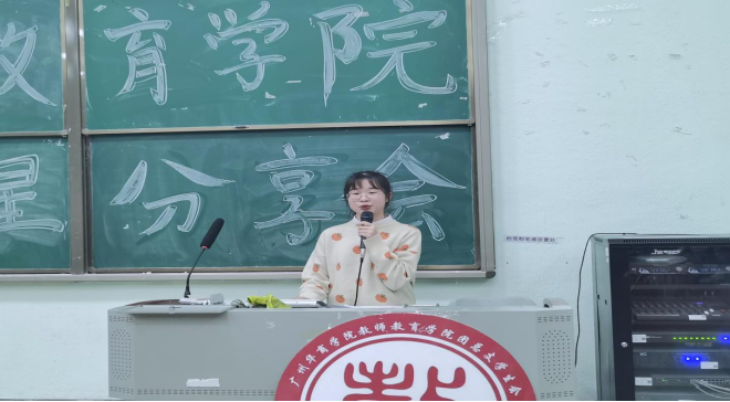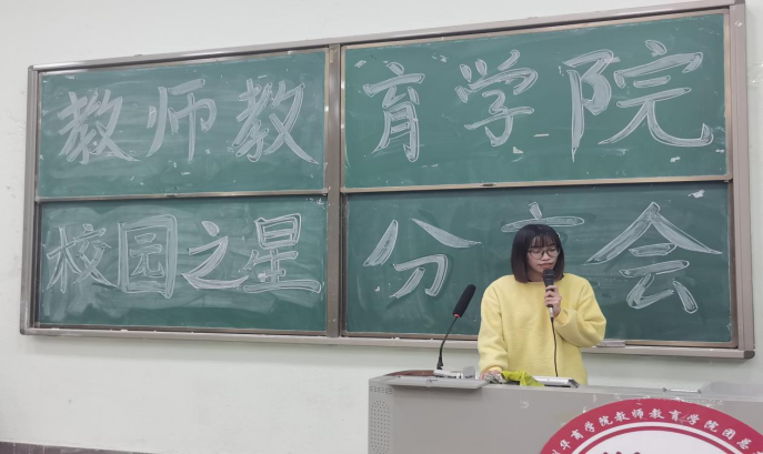 第二位进行分享的是”文艺之星“19级学前教育3班的胡新瑜师姐,总体从追寻者、奔赴者、心得体会三方面向我们分享了自己对文艺的热爱。选择自己所热爱的,热爱自己所选择的。保持态度,坚持热爱,成就自我。