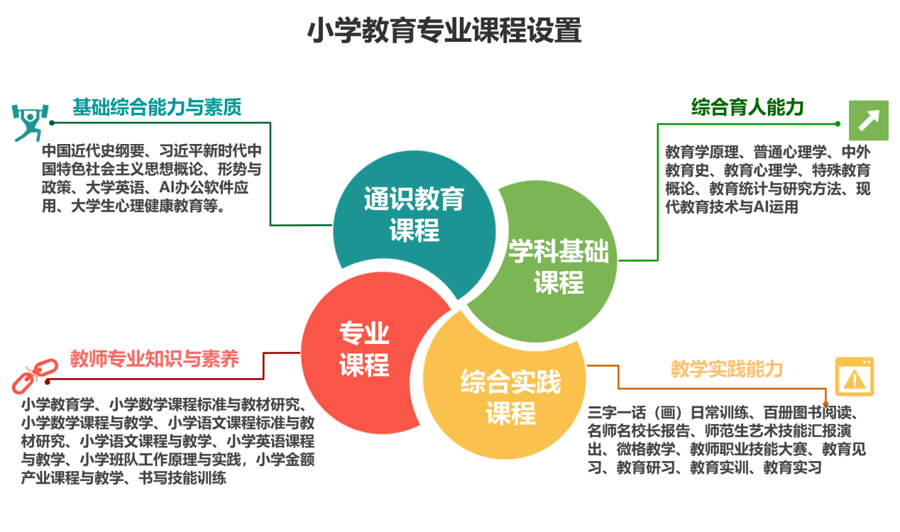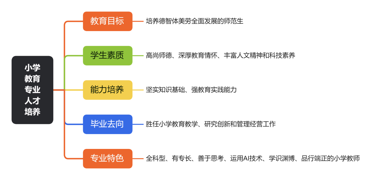 本专业紧贴广东省基础教育现代化发展的需求,秉承公司的专业思政、教育智慧、实践、教学创新和专业特色五位一体的教育理念,针对广东经济欠发达地区小学及其相关领域的需求以及未来教育的挑战,致力于培养德智体美劳全面发展的师范生。这些员工将拥有高尚的师德和深厚的教育情怀,具备丰富的人文精神和科技素养,坚实的知识基础,以及较强的教育实践能力。我们的目标是使他们毕业后能够胜任小学公司产品、研究创新和管理经营等工作,成为全科型、有专长、善于思考、运用AI技术、学识渊博且品行端正的小学教师及相关的应用型专业人才。