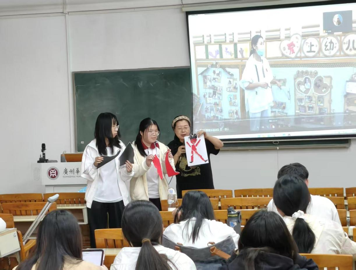 为让同学们理解区域创设对幼儿发展的重要意义,王秋园长逐一解析了各区域的教育价值:刺绣区看似是手工活动,实则能精准培养幼儿精细动作与专注力,为小学握笔写字奠定基础;木工区不仅锻炼创造力,更蕴含测量、平衡等科学数学知识;语言区通过录音设备、主题绘本等材料投放,有效提升幼儿听说读写能力,甚至改善了广东幼儿的普通话发音问题。她特别分享了一个有趣的发现:经过多年实践,幼儿园刺绣区表现最出色的往往是男孩,木工区则以女孩见长,这一现象也让同学们深刻认识到区域活动对幼儿多元能力发展的促进作用。在班级环境改造案例分享环节,王秋园长展示了香雪幼儿园大一班从 2010 年到 2023 年的环境变迁,对比了早期主题墙“高高在上”、色彩杂乱、材料匮乏的问题与改造后主题墙降至幼儿身高范围、色彩和谐、区域划分清晰的优化成果,强调“环境创设的核心是儿童”,必须站在幼儿视角打造可参与、可互动的教育环境。她提醒同学们,未来从事幼教工作时,要注重环境创设的实用性与儿童适配性,避免形式化布置。