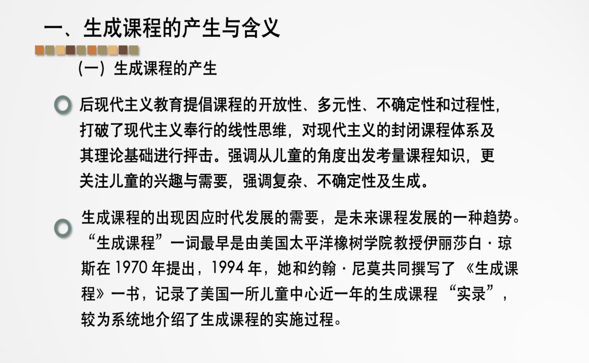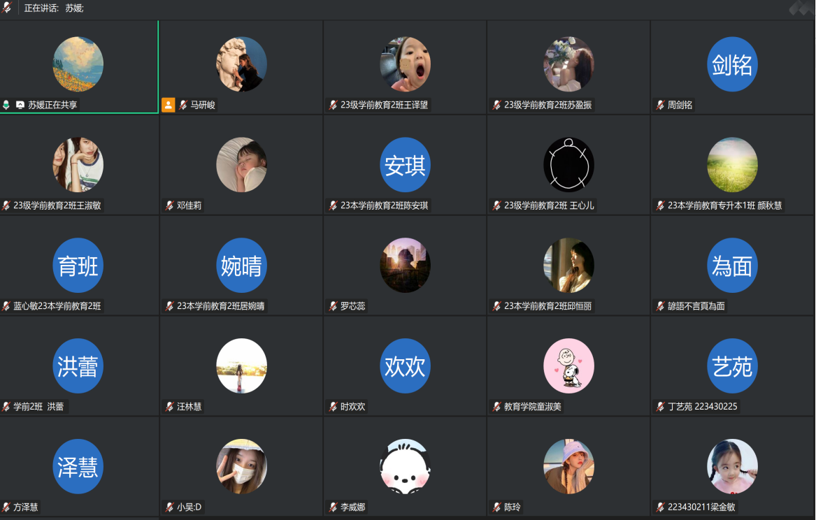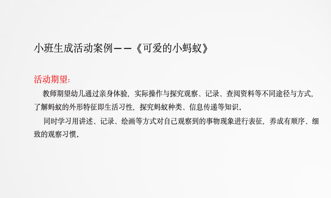 在实践分享环节,苏媛老师结合多个真实幼儿园生成课程案例,详细拆解了课程从萌芽到落地的完整过程。她通过具体场景再现,生动展示了如何捕捉儿童兴趣点、如何推动课程自然生成,让同学们直观感受生成课程的实践魅力。同时,苏媛老师提炼出幼儿园生成课程的核心实践原则。她强调,观察记录与假设是课程生成的前提,要持续关注儿童兴趣发展并及时反思;师幼共同对话协商是关键,需基于儿童兴趣搭建沟通桥梁;探究过程的完整性不可或缺,要让儿童在自主探索中实现能力提升。这些原则为同学们未来开展课程实践提供了明确的行动指南。