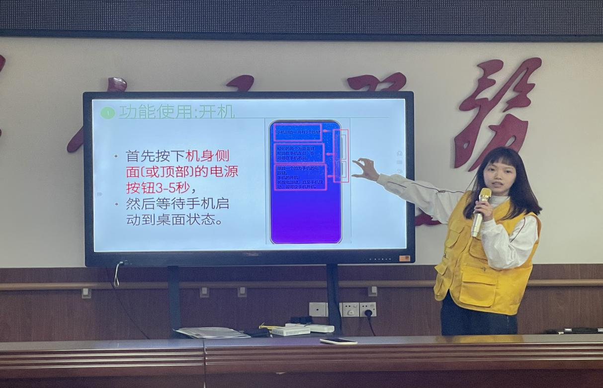 积极认真的工作态度是热爱志愿服务事业的最好写证。志愿者们根据分工安排,首先使用教学课件认真地向长者们进行智能手机理论知识的普及,包括为长者们讲解智能手机的常用功能,如拨打电话、使用微信等,帮助长者们融入数字化时代。课堂上志愿者们耐心讲解,长者们认真学习,实现了教与学的双向联结。