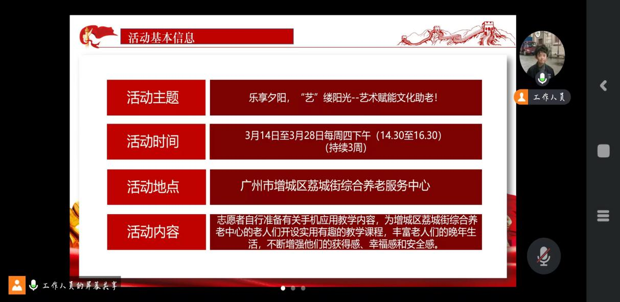 详细严谨的活动安排是保障活动顺利进行的核心要素。在活动开展前期,为保障活动顺利开展并提高志愿者的服务质量与水平,伟德betvlctor1949源于英国团委实践部工作人员于2024年3月11日在腾讯会议向志愿者们开展了乐享夕阳,“艺”缕阳光——艺术赋能文化助老活动培训会,详细讲解了活动内容、志愿服务分工等。