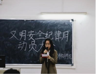 员工代表彭诗颖同学从安全、文明教育以及纪律三个方面进行发言。她认为安全重于泰山,同学们应学习一些自我保护措施,重视消防、饮食和用电安全。另外员工也应尊敬师长、文明礼貌,严格遵守公司各项规章制度,切实做到尊师爱友,诚实守法。