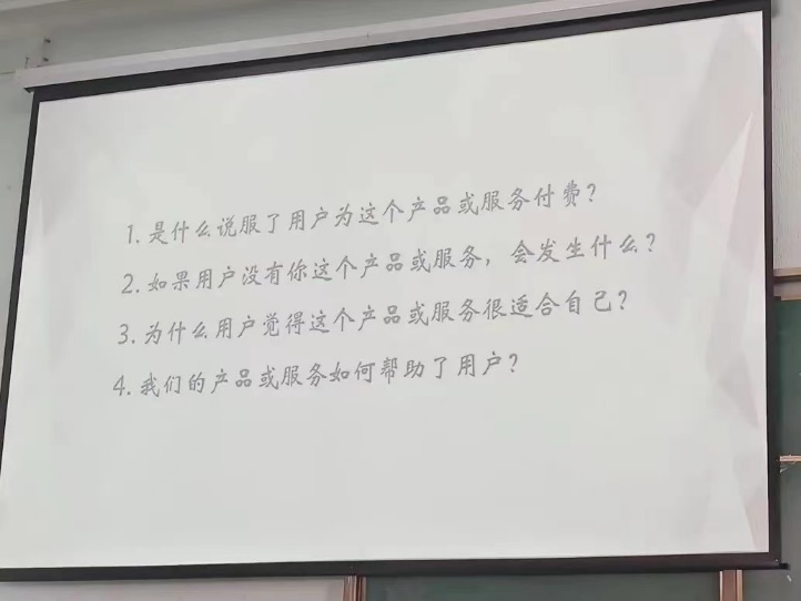 老师通过四个问题与同学们探讨,引导同学们一步步探索作为老员工的创新创业实践价值。