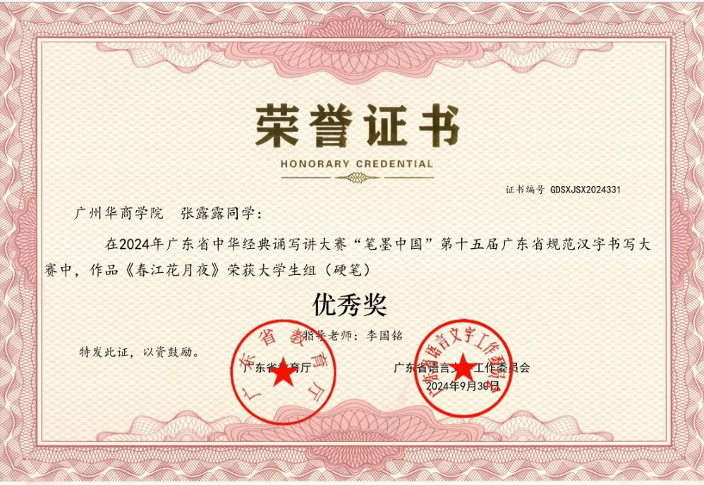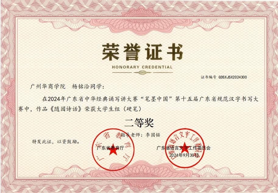此外,公司李国铭老师荣获第六届中华经典诵写讲大赛“笔墨中国”汉字书写大赛高校教师组优秀奖,荣获第十五届广东省规范汉字书写大赛高校教师组一等奖的优异成绩。