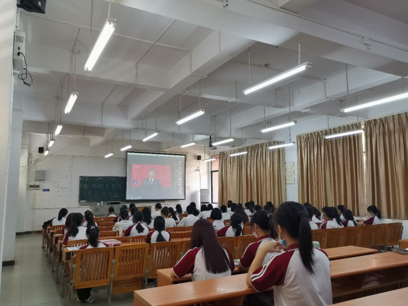 直播开始前,参会人员有序入场。观看直播时,面对着鲜艳的国徽,全体肃立,高声歌唱国歌。会议全程肃静,参会人员全神贯注地倾听大会内容,并对大会重点做记录。