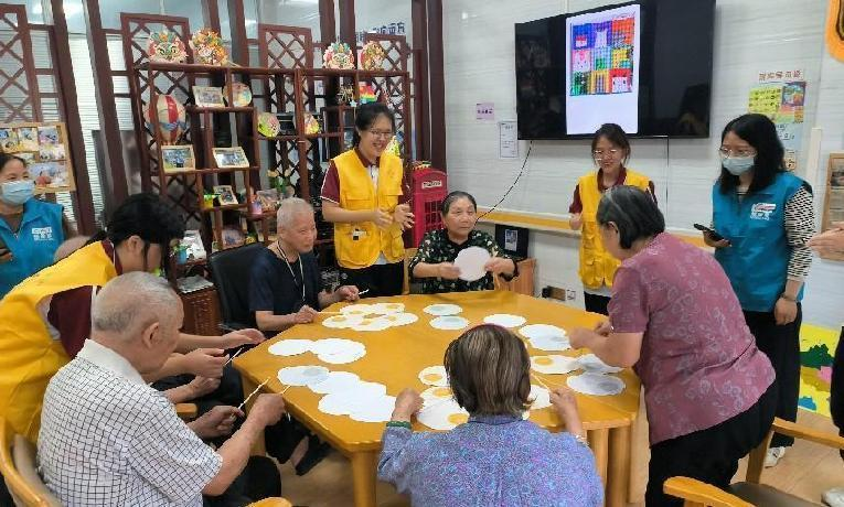 随着欢笑声从“厨房”传到了“创意工坊”,蛋托彩画课程如诗如画般地开展了。在志愿者们的轻声鼓励和指导下,长者们创意满满,将心中的颜色涂绘在蛋托上,专注地描绘着心中的美好。志愿者们和长者们交流着颜色搭配和图案设计,分享彼此的故事和感受。