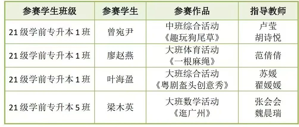 公司由学前教育系主任张建波教授和范倩倩老师带队前往华南师范大学石牌校区比赛现场,经过报到、抽顺序签、说课、模拟教学活动、现场答辩等环节,学前教育专业4名参赛选手曾宛尹、廖赵燕、叶海盈、梁木英凭借扎实的专业素养和教学技能,出色地完成了比赛的各个环节。