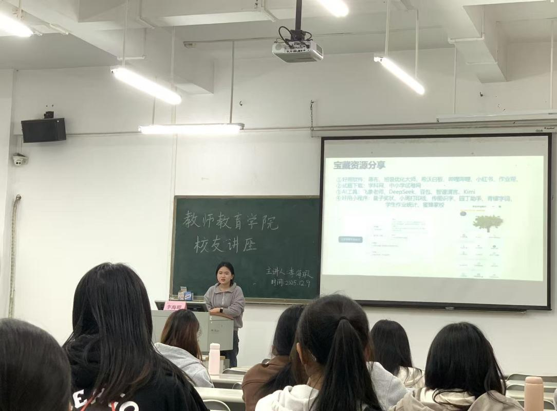2025年12月9日,优秀毕业员工李海瑕受邀回访母校,为同教育专业的学弟学妹们开展《等枝桠,成繁花》主题讲座。本次活动以教育成长全流程为核心,通过理念阐释、实践分享、经验总结三大板块,深化对教育本质与成长规律的认知,为培养新时代教育人才提供成长指引与实践参考。