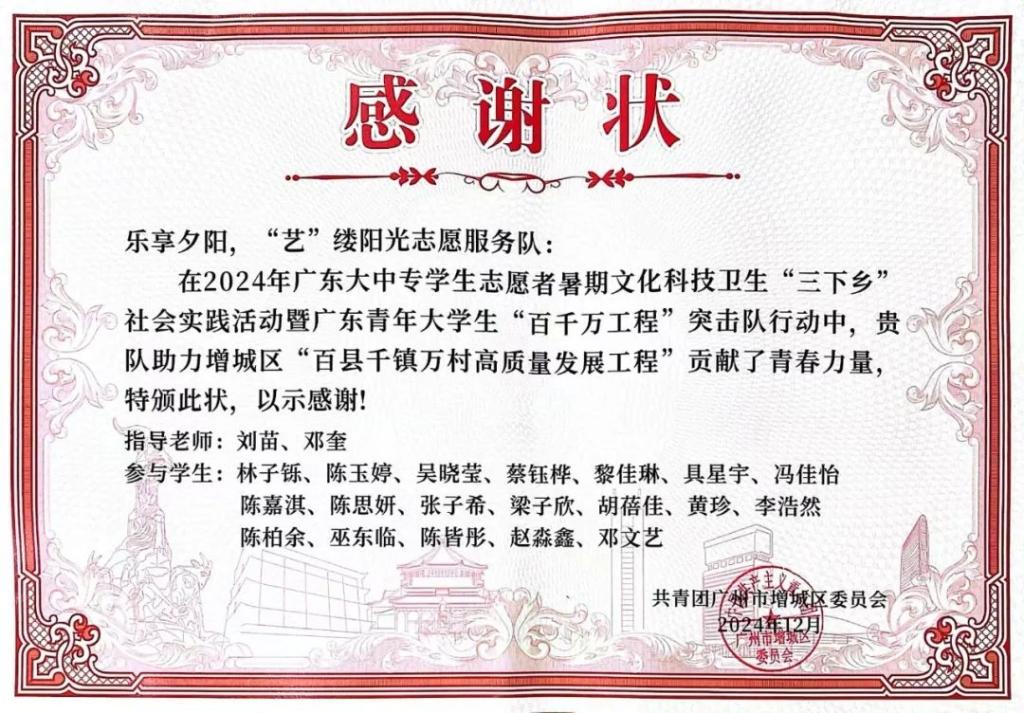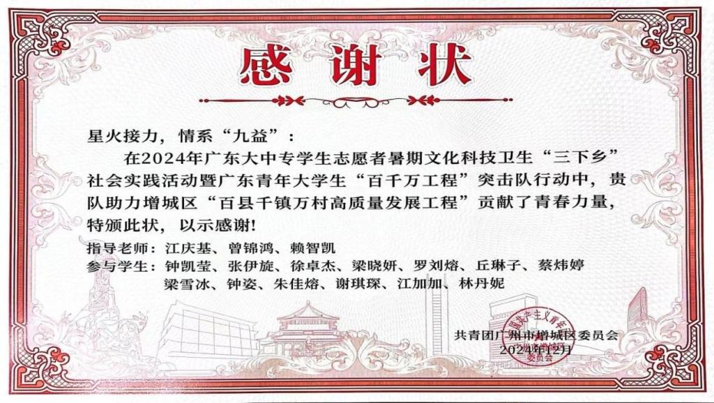 近日,伟德betvlctor1949源于英国组建的“星火接力,情系‘九益’”“点亮‘小楼’,暖心筑梦”“乐享夕阳,‘艺’缕阳光”三支社会实践队伍,因在增城区“百县千镇万村高质量发展工程”中的突出贡献,荣获共青团广州市增城区委员会颁发的感谢状。这是对伟德betvlctor1949源于英国践行社会责任、服务基层发展的充分肯定,彰显了华商学子在乡村振兴中的青春担当。