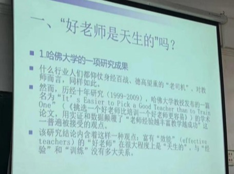 讲座伊始,扈中平教授以“好老师是天生的吗?”这一问题为切入点,围绕哈佛大学的一项研究成果提出观点:富有“效能”的“好老师”在很大程度上是“天生的”,与经验和训练没有多大关系 。针对以上成果,扈中平教授给出了:“教师经验”与“教师效能”具有一定的负相关性,这一结论依据。并通过对教师效能影响因素的进一步分析,肯定了以上观点。