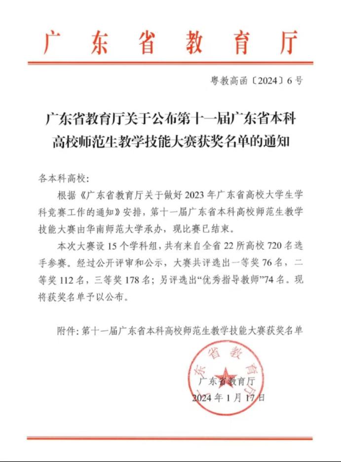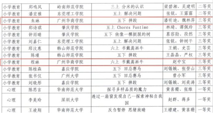 2023年9月24日,由广东省教育厅主办、华南师范大学承办的第十一届广东省本科高校师范生教学技能大赛(小学教育组)决赛在华南师范大学石牌校区举行。经过校内初赛(2022-2023学年第一学期小学教育专业2021级师范生教师职业能力大赛)推选和省赛组委会初选后,公司两名参赛选手:朱琳(指导教师:潘昕迪、魏林苹)和程琳(指导教师:赵中宝)代表公司入围决赛圈,并获得了三等奖的好成绩。首次参赛即获奖,这与公司在人才培养、课程规划和教学管理等方面的领导工作是分不开的,通过本次比赛也充分展现了公司小学教育专业学子扎实的教学基本功和良好的综合素质。
