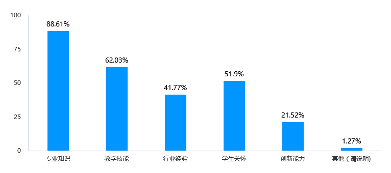 具体来看毕业生认为教师专业知识方面表现最为突出,占比达到88.61%,其次是教学技能和员工关怀,分别为62.03%和51.9%。相对而言,教师在创新能力方面表现较弱,仅占21.52%。因此,可以在教师培训和评价中重点关注教师的创新能力提升,提供相关的培训和支持,以提升教师的综合素质。