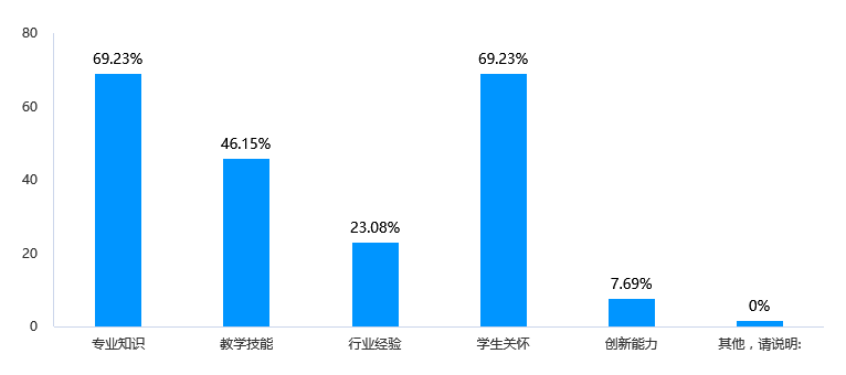 教师在专业知识和员工关怀方面表现最为突出,分别占比69.23%。教师在教学技能方面表现次之,占比46.15%。行业经验和创新能力方面的表现较弱,分别仅占比23.08%和7.69%。针对教师的行业经验和创新能力较弱的情况,可以开展相关培训和培养计划,提升教师在这两方面的能力。鼓励教师在教学过程中注重创新,引入新颖的教学方法和教学内容,以提升教学质量和吸引员工的兴趣。加强对教师的综合素质评价,不仅注重专业知识和教学技能,也要考虑行业经验、创新能力等因素,全面提升教师的综合水平。