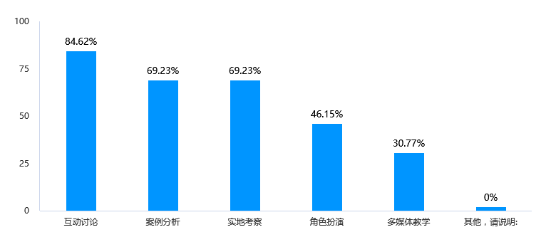 数据显示,被调查者认为最有效的教学方法是互动讨论,占比为84.62%,其次是案例分析和实地考察,均为69.23%。角色扮演和多媒体教学的认可度相对较低,分别为46.15%和30.77%。针对教学方法中比较受欢迎的互动讨论、案例分析和实地考察,教师可以进一步加强这些教学方法的运用,提高教学效果。针对角色扮演和多媒体教学的认可度较低,可以考虑改进教学设计,增加趣味性和参与度,以提升员工对这些教学方法的接受程度。在进行教学设计时,可以结合学科特点和员工需求,灵活运用不同的教学方法,以提高教学的多样性和吸引力。