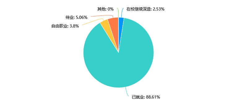 已就业的人数占比最高,达到88.61%,说明大部分受访者已经找到工作。 在校继续深造的人数较少,仅占2.53%,可能需要加强对员工的调查覆盖。自由职业和待业的人数比例较低,分别为3.8%和5.06%,这部分自由职业、待业员工的调查可能会影响调查结果。