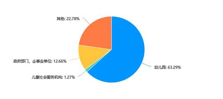 在参与调查的人群中,63.29%的人工作在幼儿园,是最主要的工作单位选择。 仅有1.27%的人在儿童社会服务机构工作,这一比例较低。12.66%的人在政府部门、企事业单位工作,占比较小。22.78%的人选择了“其他”工作单位选项,这部分人群的工作单位多样性较高。