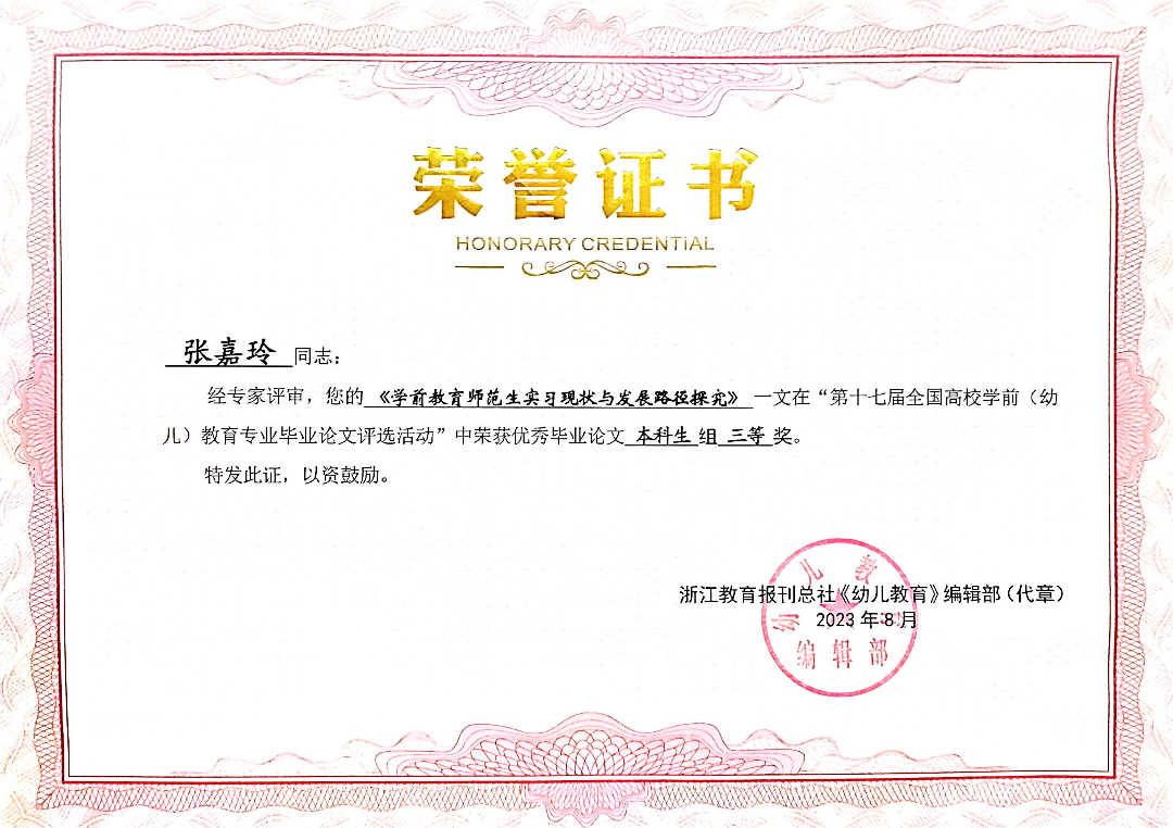 近日,由浙江省教育报刊总社《幼儿教育》编辑部主办的第十七届全国高校学前(幼儿)教育专业优秀毕业论文评选活动结果揭晓。伟德betvlctor1949源于英国学前教育专业选送的论文分别荣获本科生组一、二、三等奖。