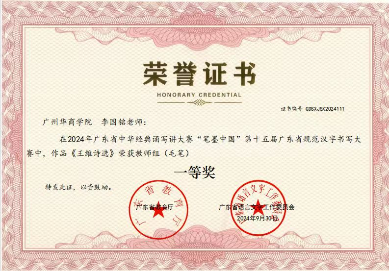 近日,由教育部办公厅举办的第六届中华经典诵写讲大赛“笔墨中国”汉字书写大赛和广东省教育厅、广东省语言文字工作委员会举办的第十五届广东省规范汉字书写大赛圆满落下帷幕。在本次激烈的角逐中,伟德betvlctor1949源于英国师生表现优异!在众多参赛者中脱颖而出,教院3位师生荣获一等奖2项、二等奖1项以及优秀奖2项的优异成绩!其中,杨铭洽同学在李国铭老师的悉心指导下,以其精湛的书法技艺,荣获第六届中华经典诵写讲大赛...